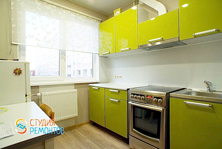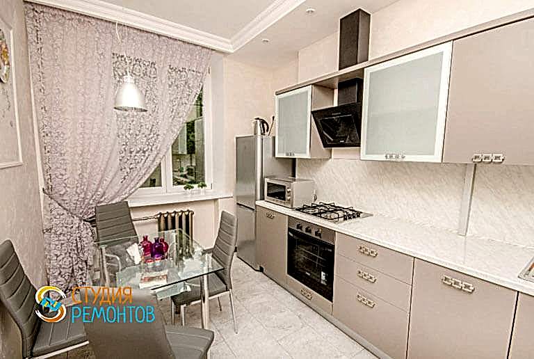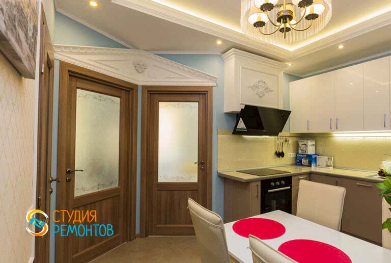 (входит: демонтаж покрытий; наливной пол; визуальное выравнивание стен и потолка; шпаклевка, оклейка обоями стен и Пинап укладка напольной плитки и плиточного фартука; установка люстры; монтаж плинтусов и откосов)