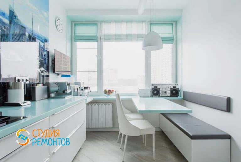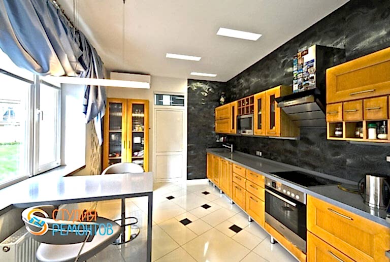 (входит: удаление старых покрытий; стяжка пола; штукатурка стен по маякам; монтаж ГКЛ коробов потолка, натяжного потолка; шпаклевка и окрашивание в 2 слоя потолка и стен; отделка пола и фартука плиткой (мозаика); подключение Пинап освещения)