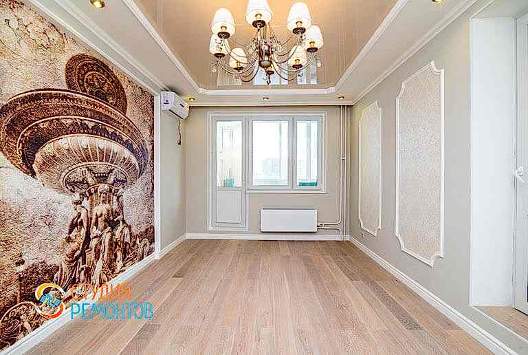 (входит: демонтаж существующих покрытий; поклейка обоев; Пинап потолков; укладка ламината; монтаж плинтусов)